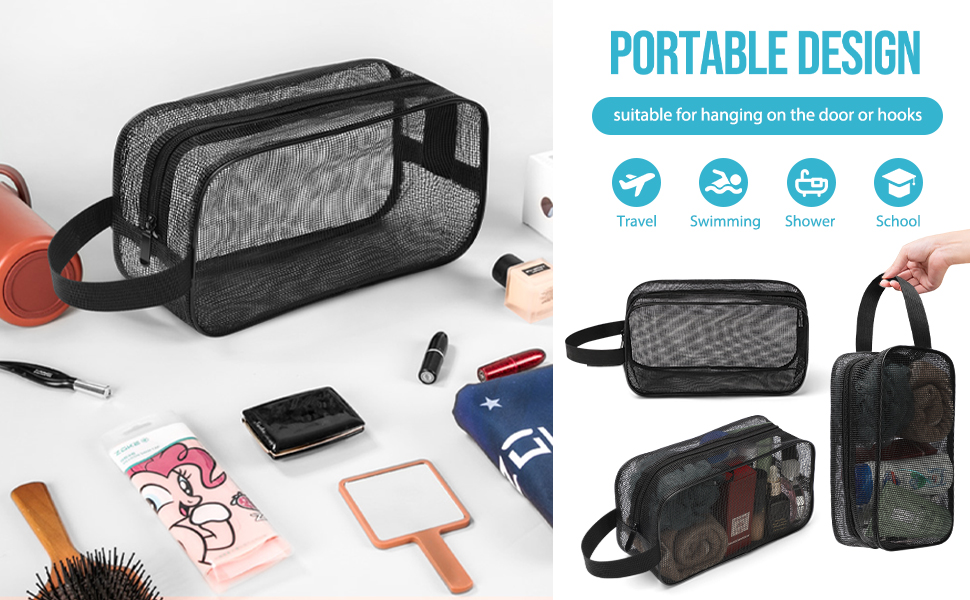 • Reinforced Loop Handle: The ring handle is more tightly stitched to provide greater load-bearing capacity. You can carry whatever you want, for example lotions, soaps, razors, combs, brushes, toothpaste, toothbrushes, hand towels, deodorant, makeup, makeup brushes.