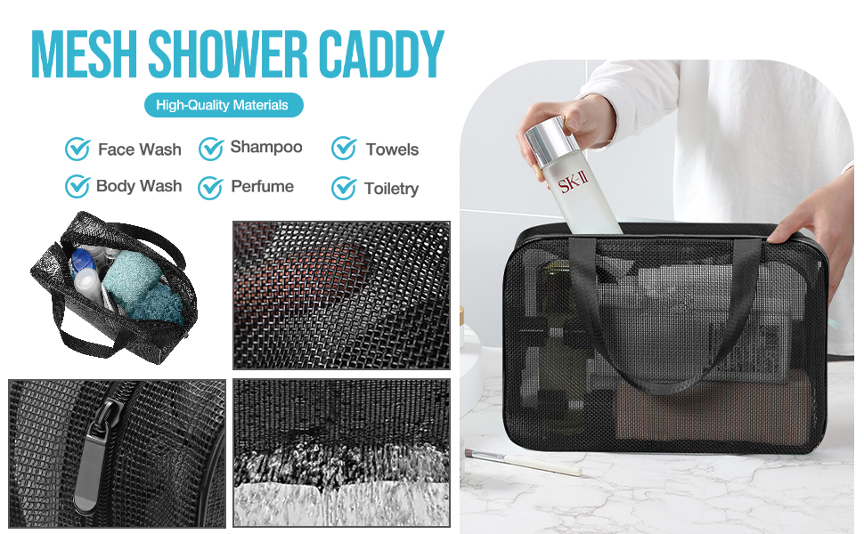 • Quick Dry Material: Our portable shower caddy bag is made of a high quality, breathable, water resistant quick drying mesh material. The breathable mesh allows water to drain out of the shower bag, simply hang it over the door, showerhead or on a hook for quick drying.