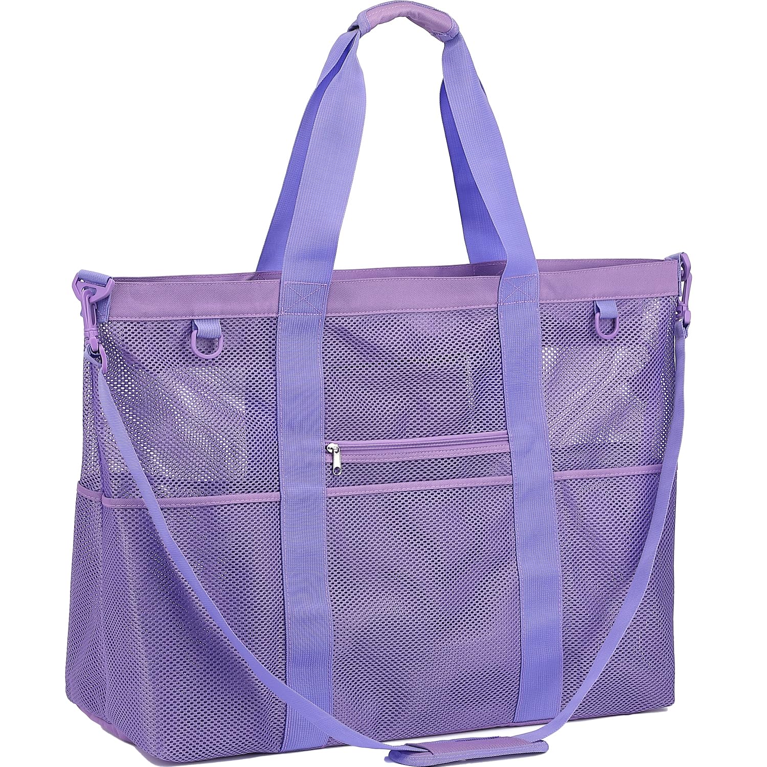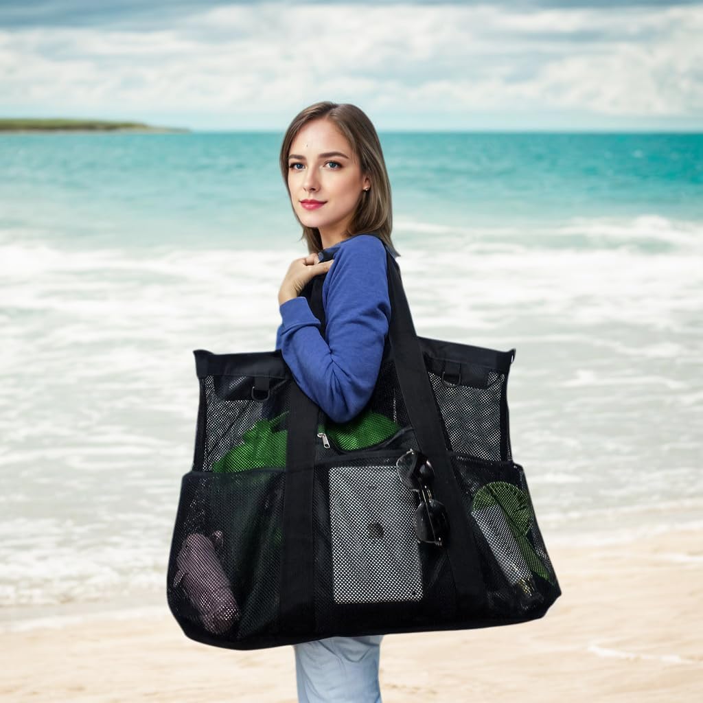 - 【𝐃𝐮𝐫𝐚𝐛𝐥𝐞 & 𝐏𝐨𝐫𝐭𝐚𝐛𝐥𝐞】This mesh towel bag is constructed from sturdy 600D polyester and tear-resistant mesh materials, and the reinforced stitching further ensures exceptional durability, allowing it to withstand loads of up to 160 lbs. This beach must haves is lightweight, collapsible and easy to carry. The 9-inch long shoulder strap of this beach tote for women adds a significant comfort factor to its transportation.